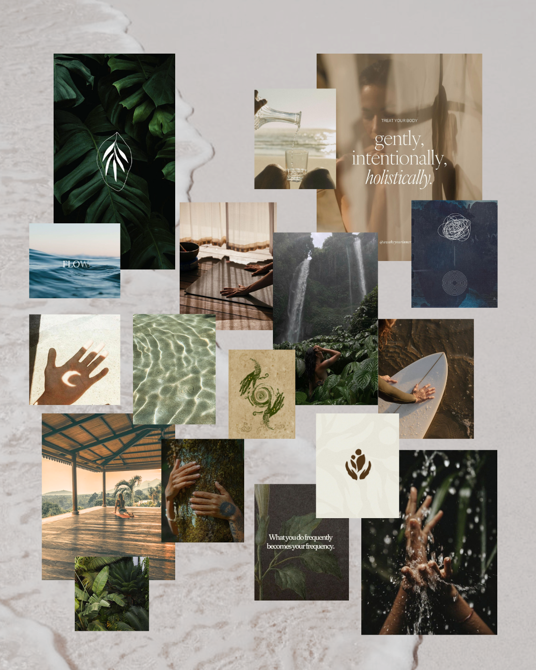 The brand lives in words like earthy, intentional, rejuvenating, soulful, and communal. Its voice is warm and grounding, gently encouraging guests to relax into slower rhythms and deeper presence. The palette is drawn straight from Costa Rica herself: deep leafy greens, sun-lit golds, ocean blues, soft coconut cream, and warm wood tones. The art direction pairs organic line-drawings, rainforest textures, yoga at golden hour, lush greenery, moving water, and hands touching nature—the kind of imagery that makes you feel the humidity and hear the cicadas.