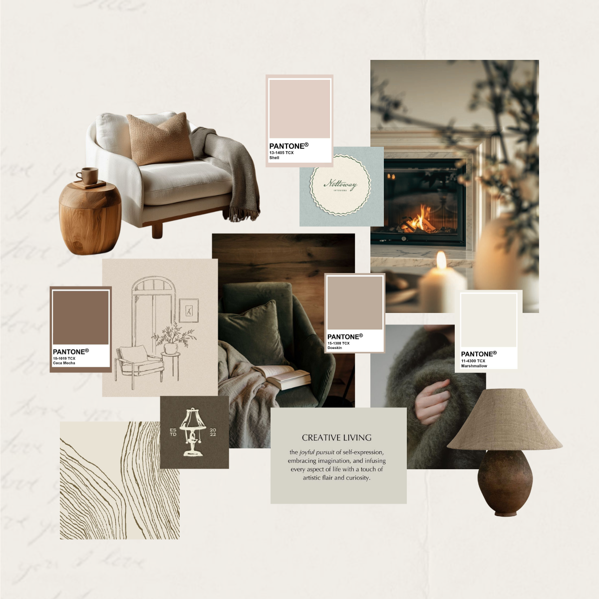 The brand voice speaks like a friendly neighbor with great taste—warm, reassuring, honest, and gently poetic, creating emotional ease rather than transactional tone. The visual palette uses earthy browns, winter-white cream, ember-glow oranges, and muted evergreen tones, capturing the feeling of candlelight reflecting on natural wood. The art direction leans into tactile textures—wool knits, ceramic edges, stacked firewood, flickering candles, quiet winter windows—evoking sanctuary and slow living.