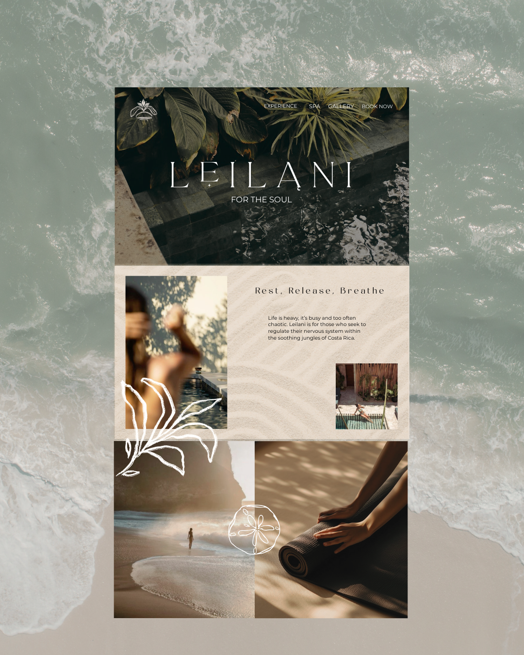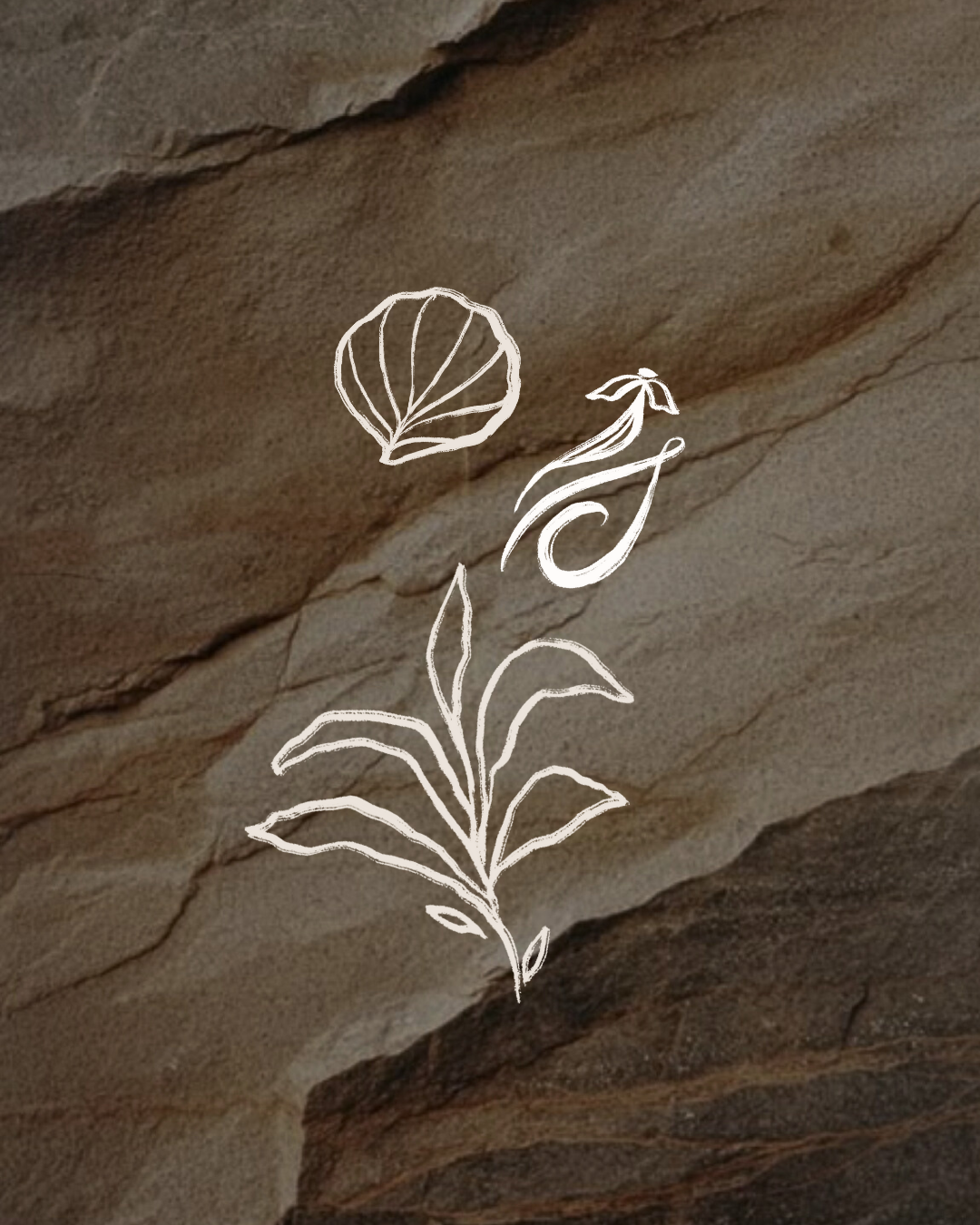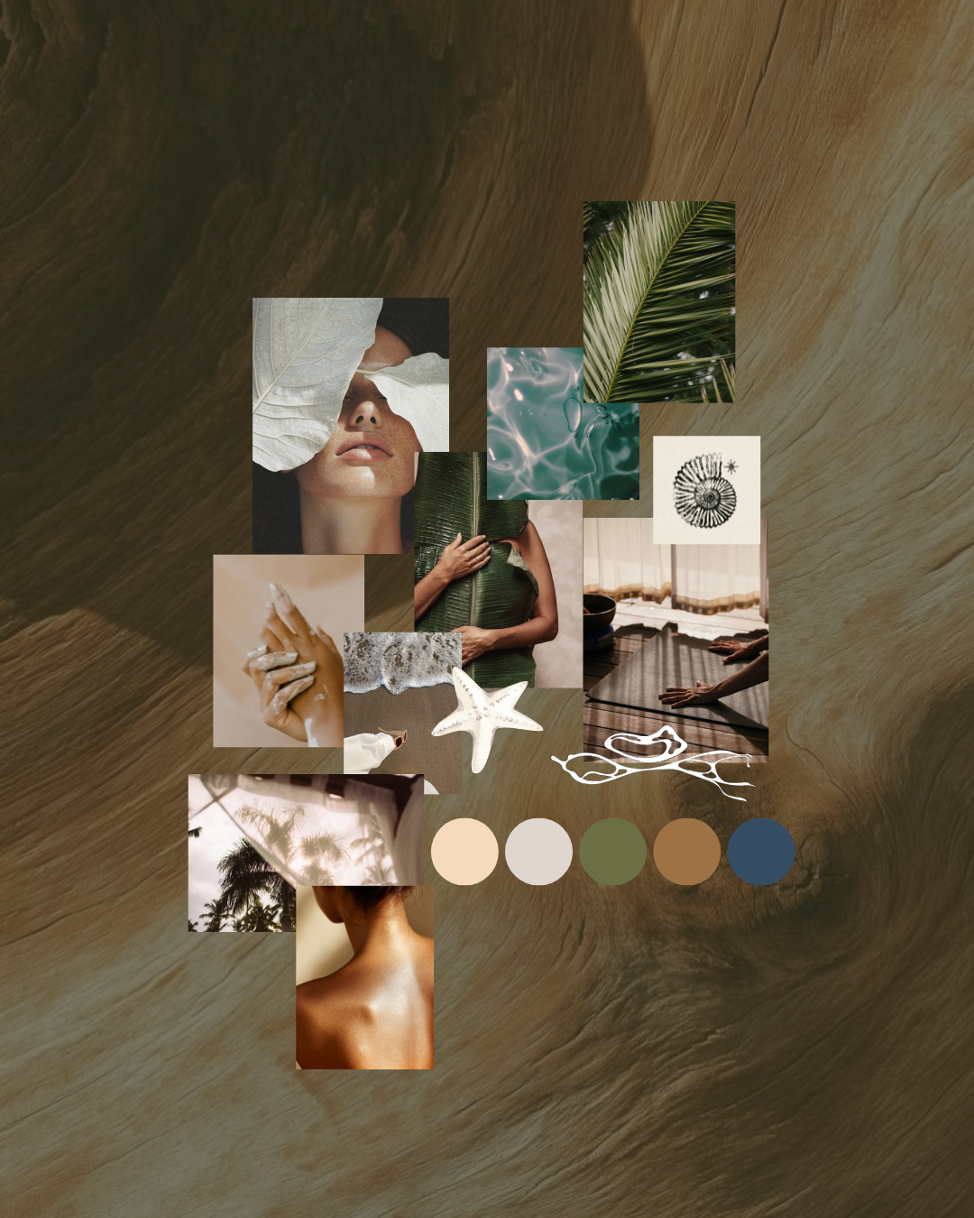Its brand feeling is wrapped in words like healing, sensual, grounded, earthy, serene, and sacred. The voice is warm and poetic, with a softness that feels like someone placing a gentle hand on your shoulder—encouraging, intimate, and soul-forward. The visual palette pulls from sun-dusted skin tones, palm green, soft shell white, clay brown, and ocean indigo—infused with natural warmth and tropical stillness. The art direction blends tactile materials like stone, linen, water, and leaf textures with minimalist hand-drawn symbols that feel ancient yet personal.
