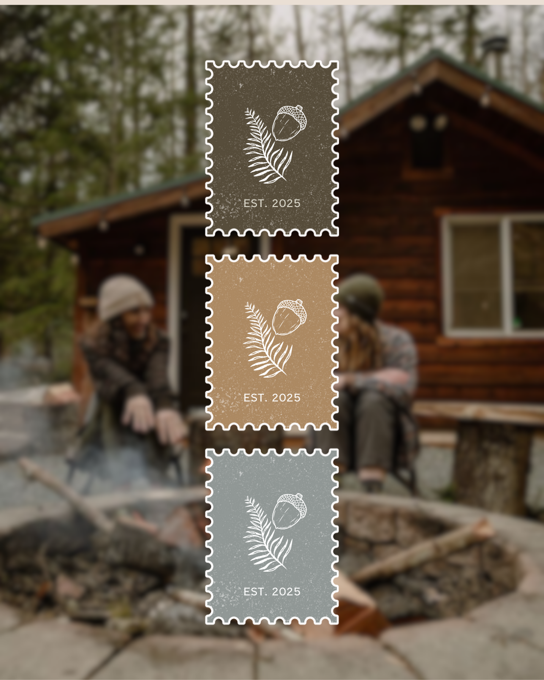 The brand voice is cozy-outdoorsy and welcoming, with a hint of old-soul storytelling—the kind that invites you to sit by the fire and stay awhile. The visual palette blends deep evergreen, stormy slate, bark-brown, worn-in oatmeal, and mist-blue—rooted in woodland hues, fireside glow, and fog-soft mornings. The art direction combines rustic illustrations and stamp-style marks like the acorn and fern emblem, worn textures, vintage-style typography, and candid moments of human connection around cabins, campfires, and hammocks.