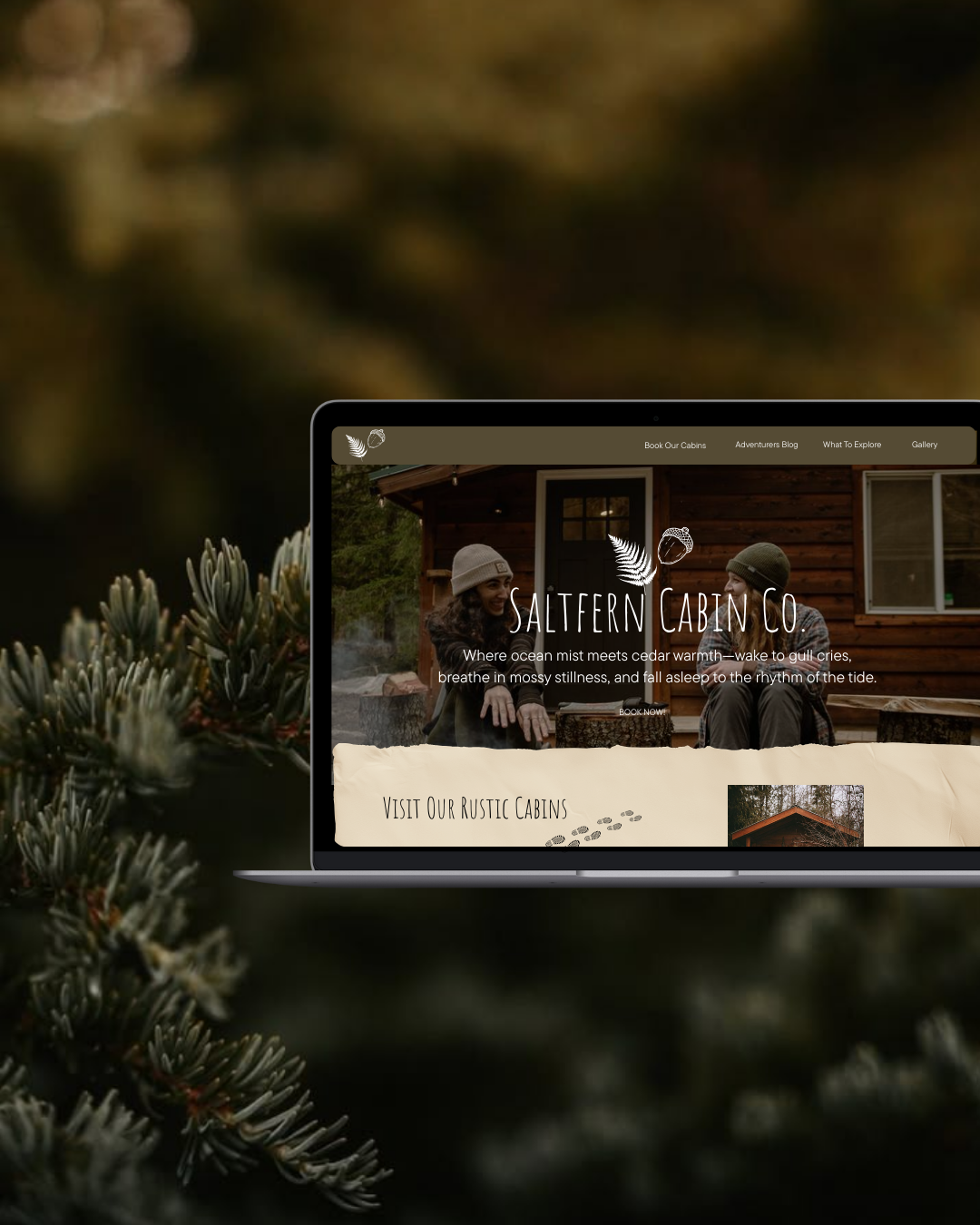 Saltfern Cabin Co. is the brand child of crackling fires, misty woods, and boots that track in a bit of earth. Inspired by a tiny town in Washington where the cedar scent hangs in the air, I built this brand to feel like a handwritten note from the forest: friendly, nostalgic, and a little adventurous. The target guests are couples seeking slow weekends, families wanting unplugged memory-making, and Pacific Northwest wanderers who crave cabins over hotels, texture over polish, and warmth over sterile minimalism.