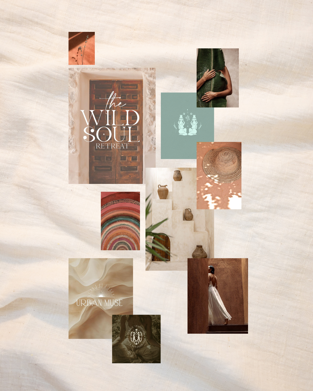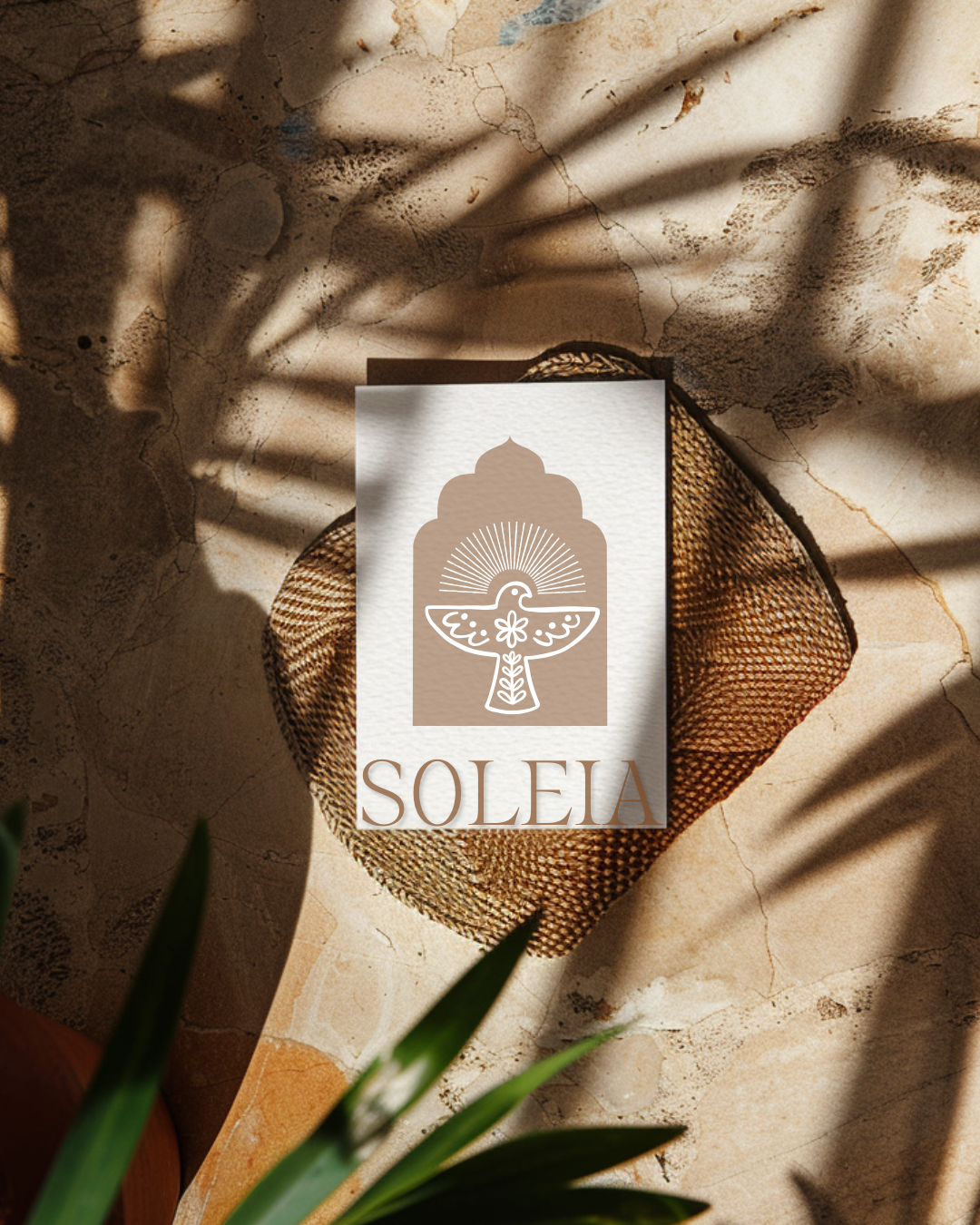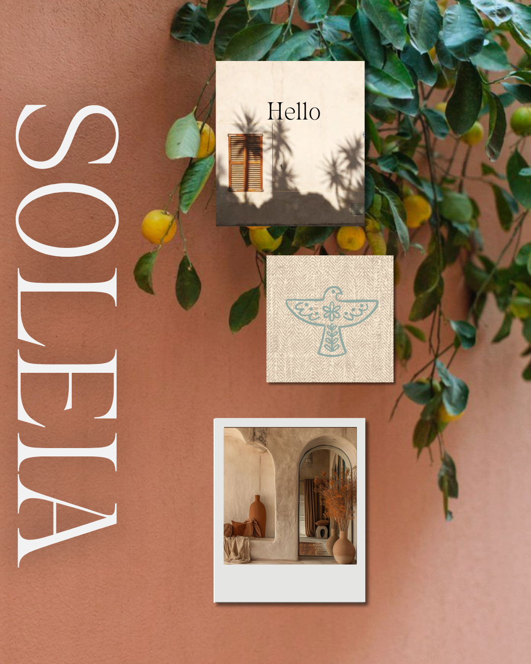 The brand radiates earthy optimism—rooted in words like soulful, bohemian, warm, handcrafted, desert-kissed, and joy-filled. The voice is gentle, playful, and sun-warmed—speaking with that barefoot-on-tile ease, like a local telling you where the secret sunset spots are. The palette glows in terracotta shades, soft clay, woven straw, dusty apricot, and sage-green accents. The art direction is tactile and textural—ceramic vessels, linen drapery, macrame, arched architecture, palms, imperfect edges, and sun-cast shadows dancing across sandy walls.
